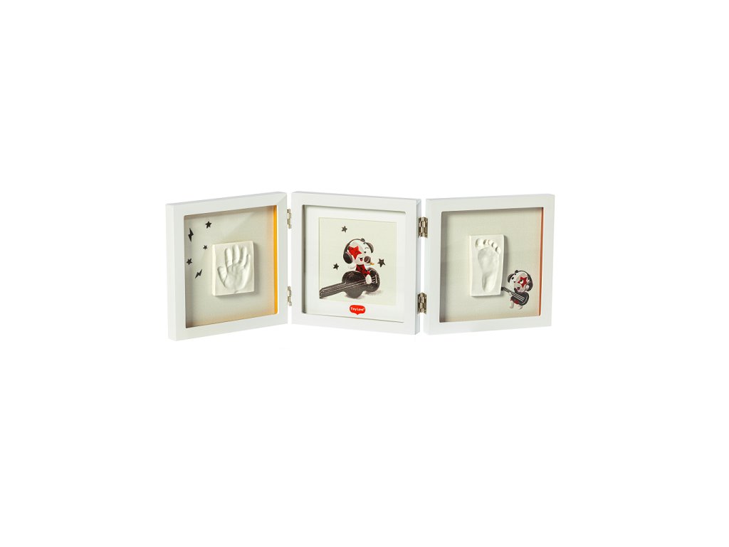 Dřevěný rámeček Tiny Creations Double Frame nabízí tři oddělené prostory pro fotografii a otisk ručičky a nožičky Vašeho miminka.