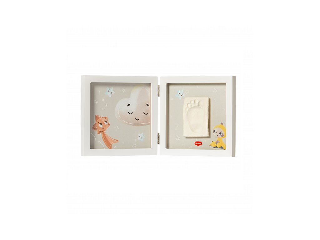 Dřevěný rámeček Tiny Creations Simple Frame nabízí dva oddělené prostory pro fotografii a otisk ručičky a nožičky Vašeho miminka.