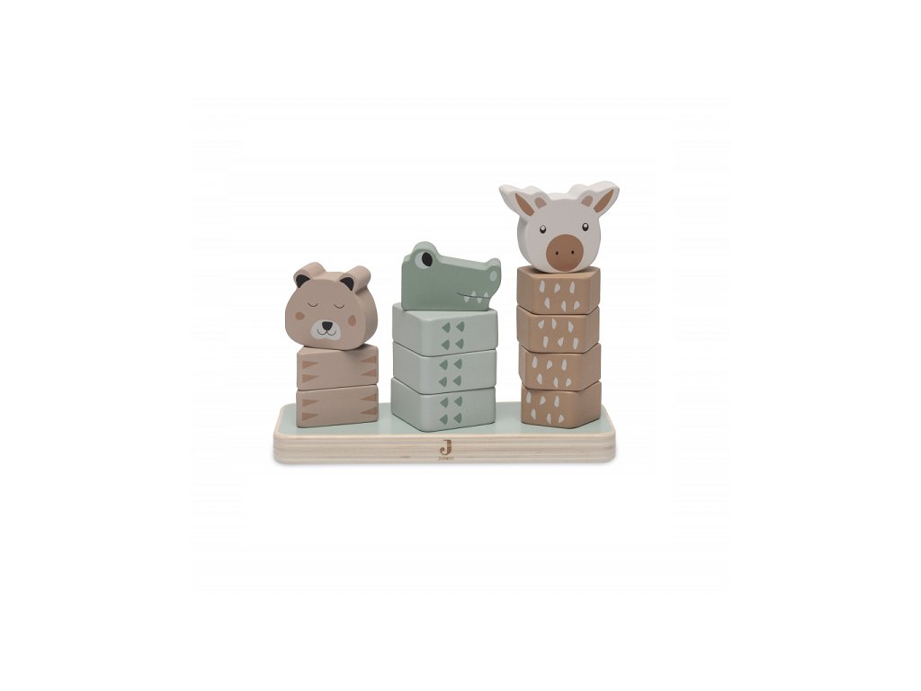 Dřevěná zvířátka z džungle jsou tvořena hlavičkou a kostkami, které se postupně navlékají na základnu. Hračka pomáhá rozvíjet jemnou motoriku dítěte a může sloužit i jako krásná dekorace v dětském pokoji.