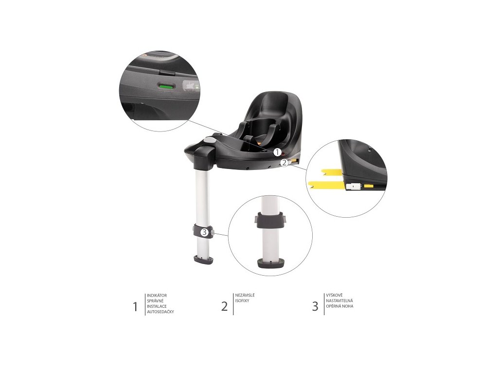 Nezávislé ISOFIX s indikátory pro snadnou a bezpečnou instalaci autosedačky do vozidla. Autosedačka disponuje opěrnou nohou, která přidává další bod pro větší stabilitu i opěrná noha má svůj indikátor správného nastavení. Lepší stabilitu zajistí také bezpečnostní oblouk. Správnou instalaci autosedačky na základnu vám potvrdí indikátory správné instalace. Sejmutí autosedačky ze základny jednoduše přes pojistku.