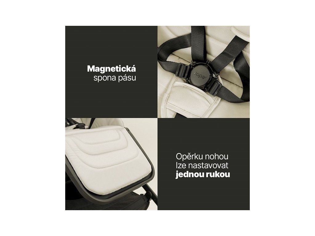 Praktickými detaily jsou magnetická spona pásu, uzavíratelný košík, odklápěcí hrazda a madlo pro snadné přenášení složeného kočárku. Kočárek se snadno skládá a přenáší, a to i jednou rukou. Ve výbavě nechybí pláštěnka, nánožník a stylová přebalovací taška.