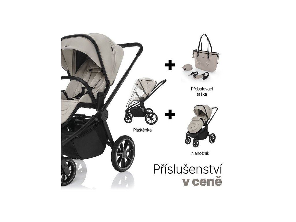 Praktickými detaily jsou magnetická spona pásu, uzavíratelný košík, odklápěcí hrazda a madlo pro snadné přenášení složeného kočárku. Kočárek se snadno skládá a přenáší, a to i jednou rukou. Ve výbavě nechybí pláštěnka, nánožník a stylová přebalovací taška.