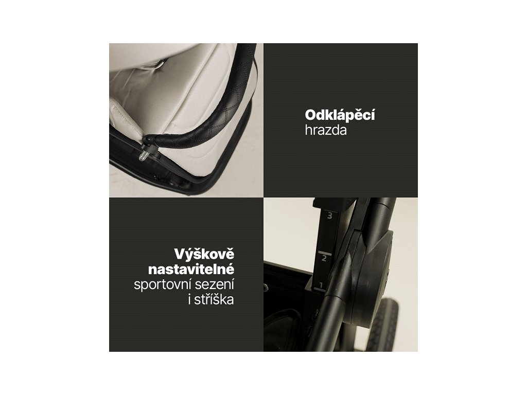 Kočárek umožňuje otočné sportovní sezení, které můžete nasměrovat po i proti směru jízdy. Velkou výhodou je výškově nastavitelné sezení i stříška, každá ve třech úrovních. Přizpůsobí se tak nejen výšce rodičů, ale i růstu dítěte.