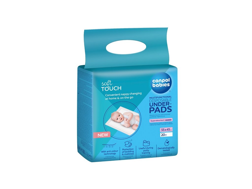 Hygienické multifunkční podložky s voděodolnou ochrannou vrstvou na spodní straně se hodí pro jakoukoliv situaci. Vždy poskytují čistý a hygienický povrch pro přebalování vašeho miminka. Jsou užitečné při cestování, na procházce, při návštěvě kliniky, jako ochrana matrace nebo kočárku (protékání plenky, rozlití atd.) a při učení na nočník. Superabsorpční podložka rychle a účinně absorbuje tekutiny a zadržuje vlhkost uvnitř spodní podložky, čímž chrání před únikem.