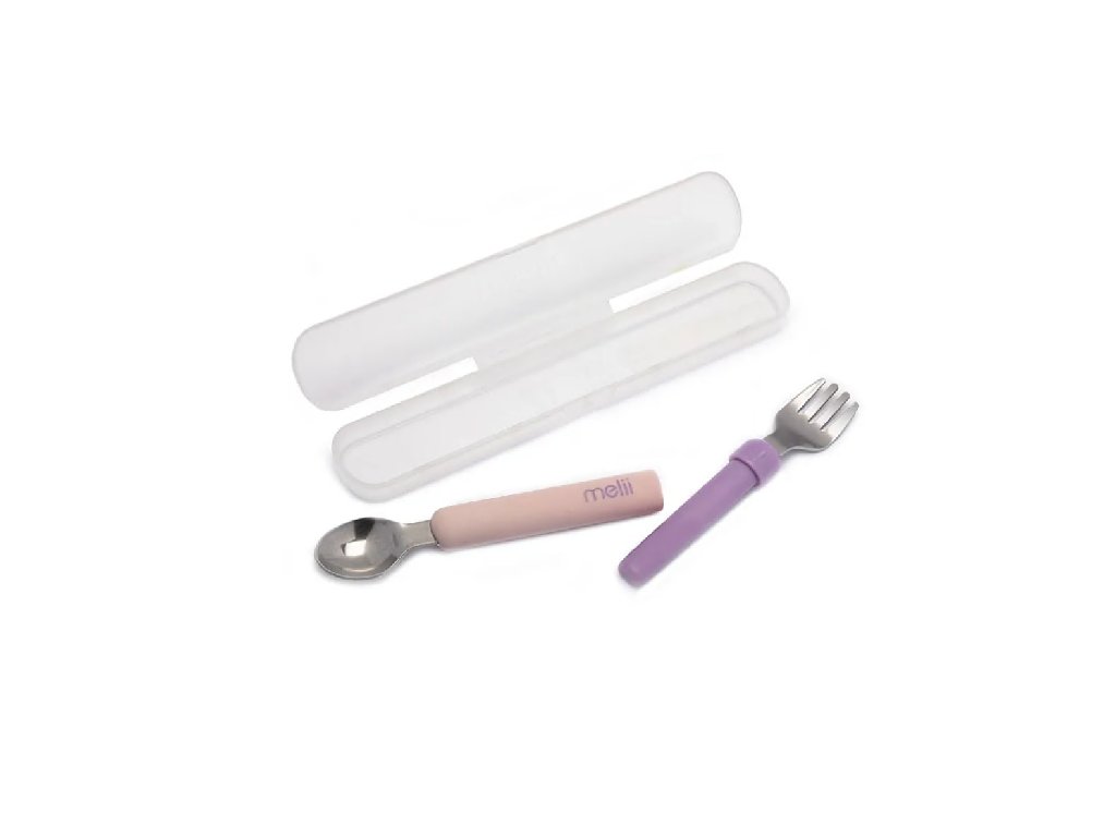 MELII dětská vidlička a lžička s pouzdrem Růžová/Fialová