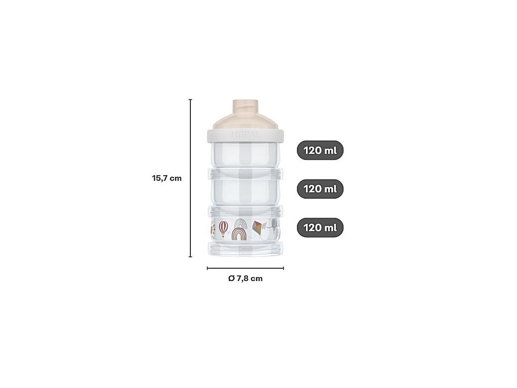 Třídílná nádoba na sušené mléko Little Dutch Forest Friends nabízí jednoduchý a hygienický způsob přípravy kojeneckého mléka doma na cestách. Nádoba obsahuje tři stohovatelné kelímky, které jsou jednotlivě uzavřeny šroubovacími víčky. Praktické nasýpací víčko nahoře usnadňuje dávkování sušeného mléka do lahve.