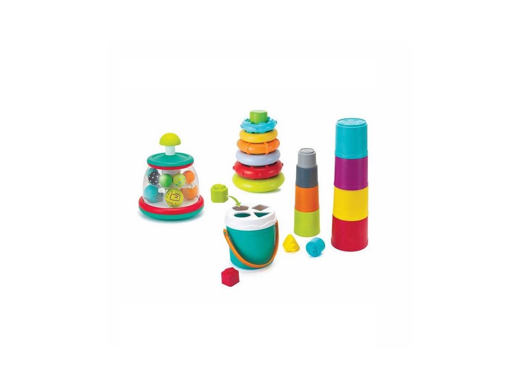 - Stohovací kelímky v kyblíku - osm barevných stohovacích kelímků, které můžete stavět až do výšky 70 cm nebo naopak vkládat do sebe + kyblík s víkem, ve kterém jsou otvory čtyř různých tvarů, do nich pasují čtyři barevné kostky. Stohovací kelímky spolu s kostkami snadno složíte do kyblíku, který je opatřen praktickým držadlem.