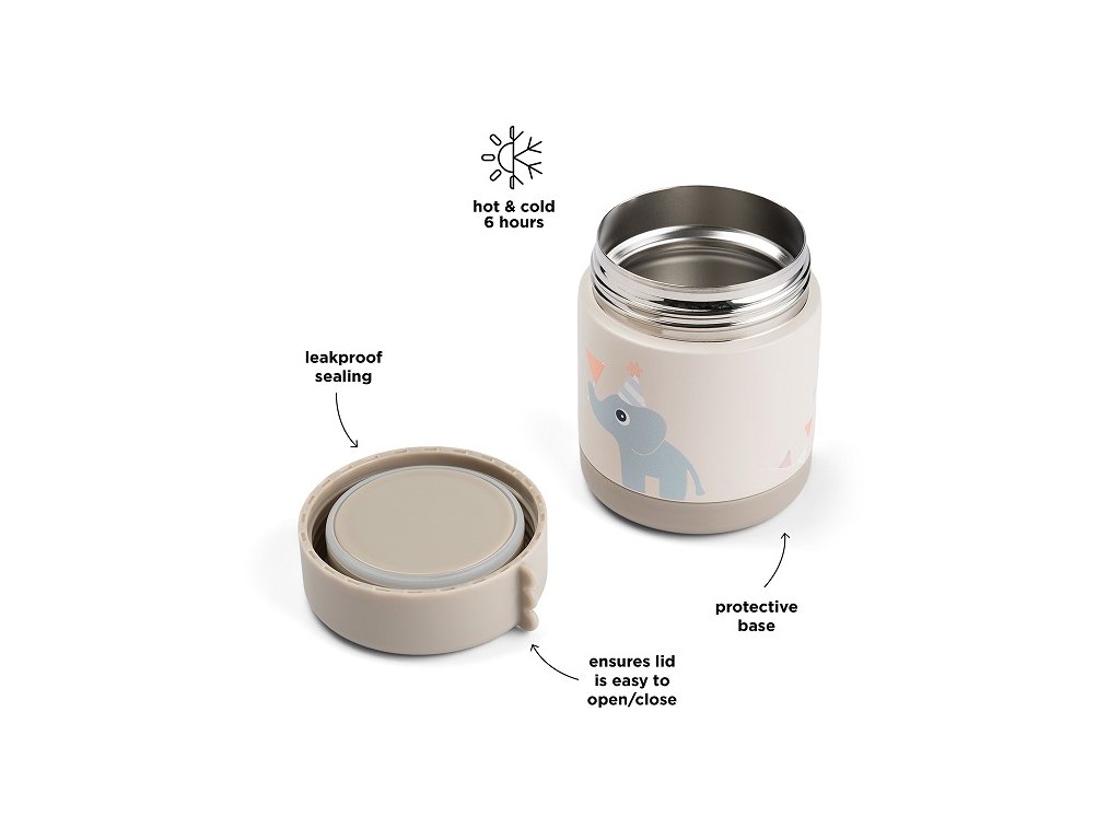 Roztomilá dětská termonádoba s krásným motivem Elphee, Lalee a Birdee. Termonádoba má snadné otevírání. Silikonové těsnění činí nádobu vzduchotěsnou a nepropustnou. Udržuje jídlo teplé nebo chladné po dobu až 6 hodin. Ideální pro předškolní, školní a venkovní dobrodružství.