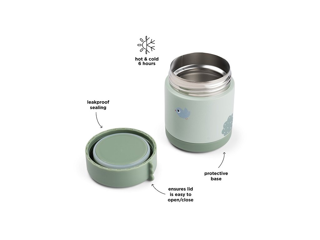 Roztomilá dětská termonádoba s krásným motivem Croco a Birdee. Termonádoba má snadné otevírání. Silikonové těsnění činí nádobu vzduchotěsnou a nepropustnou. Udržuje jídlo teplé nebo chladné po dobu až 6 hodin. Ideální pro předškolní, školní a venkovní dobrodružství.