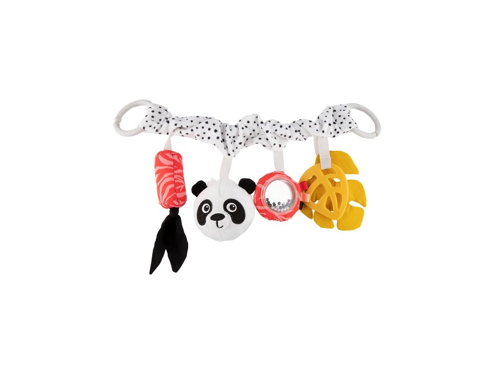 Senzorická závěsná hračka na kočárek/autosedačku BabiesBoo je skvělý nápad na první hračku pro miminka, která zpříjemní každou procházku a cestu. Perfektní pro dětský kočárek a autosedačku – závěsnou hračku lze upevnit pomocí bezpečných a pohodlných plastových kroužků na obou koncích. Hračky připevněné k závěsné hračce pomáhají rozvíjet motorické dovednosti (úchop, tahání, třesení), aktivují sluch (šustící prvky, chrastítka), zrak (kontrastní barvy, zrcátko) a hmat (různé textury). Decentní, ale kontrastní barvy povzbudí dítě k uchopení a hře. Každý prvek závěsné hračky má jinou funkci – zvoneček s mašlí vydává jemné zvuky, měkká plyšová panda, vyrobená z příjemného na dotek a měkkého materiálu, po zmáčknutí drží tvar, zrcátko je obklopené barevnými visačkami s chrastítkem, dva listy – jeden příjemně šustí a druhý v podobě kousátka přinese úlevu při prořezávání zoubků.